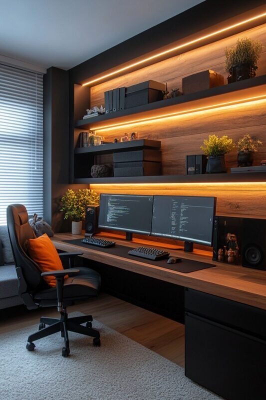 Pencahayaan adalah salah satu elemen paling penting dalam ruang kerja modern. Bukan hanya soal lampu utama di plafon, tapi juga tambahan lampu sorot kecil, LED strip, atau lampu meja untuk menciptakan ambience yang nyaman.