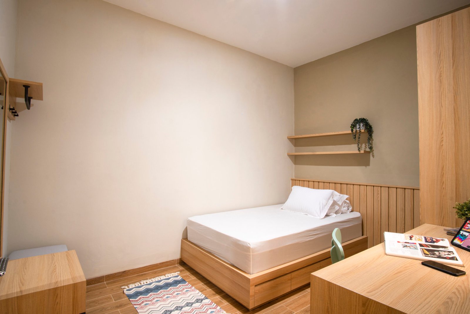 • Kenyamanan Visual: Warna pastel menenangkan, berpadu dengan putih dan kayu untuk atmosfer hangat.