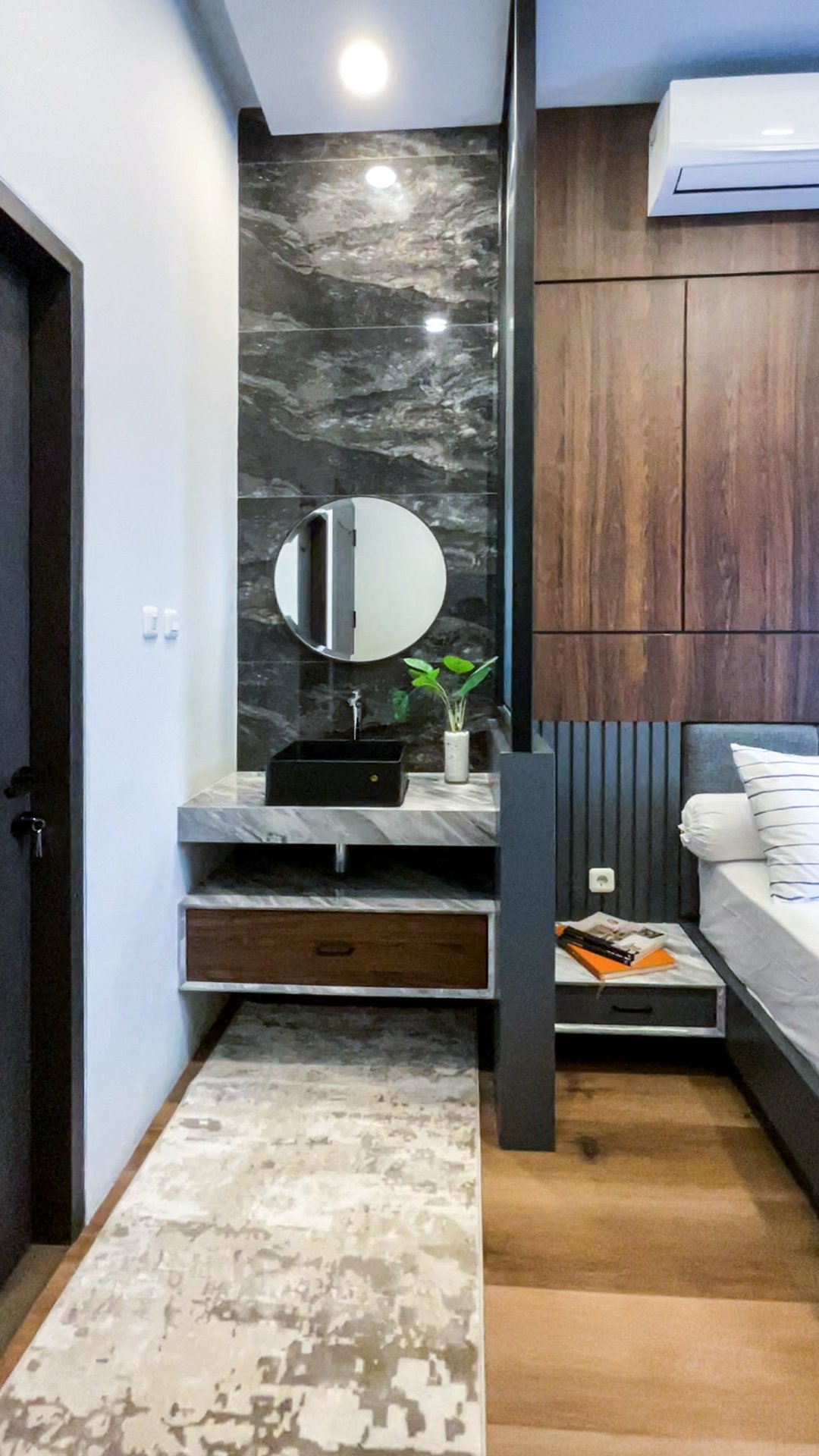 Kamar tamu ini dirancang dengan atmosfer hangat dan nyaman, menghadirkan kombinasi material kayu, marmer, dan elemen modern yang sederhana. Penataan ruangnya efisien, menghadirkan keseimbangan antara fungsi, estetika, dan kenyamanan bagi penghuni maupun tamu.