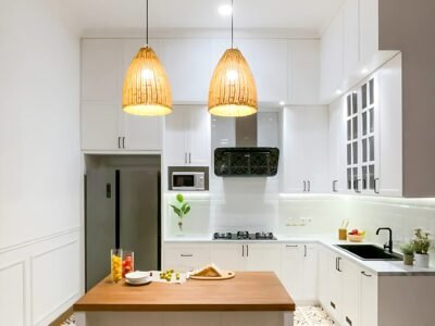 • Warm Elegance: Finishing kayu terang dan pencahayaan warm light pada kabinet atas menambah kesan cozy.