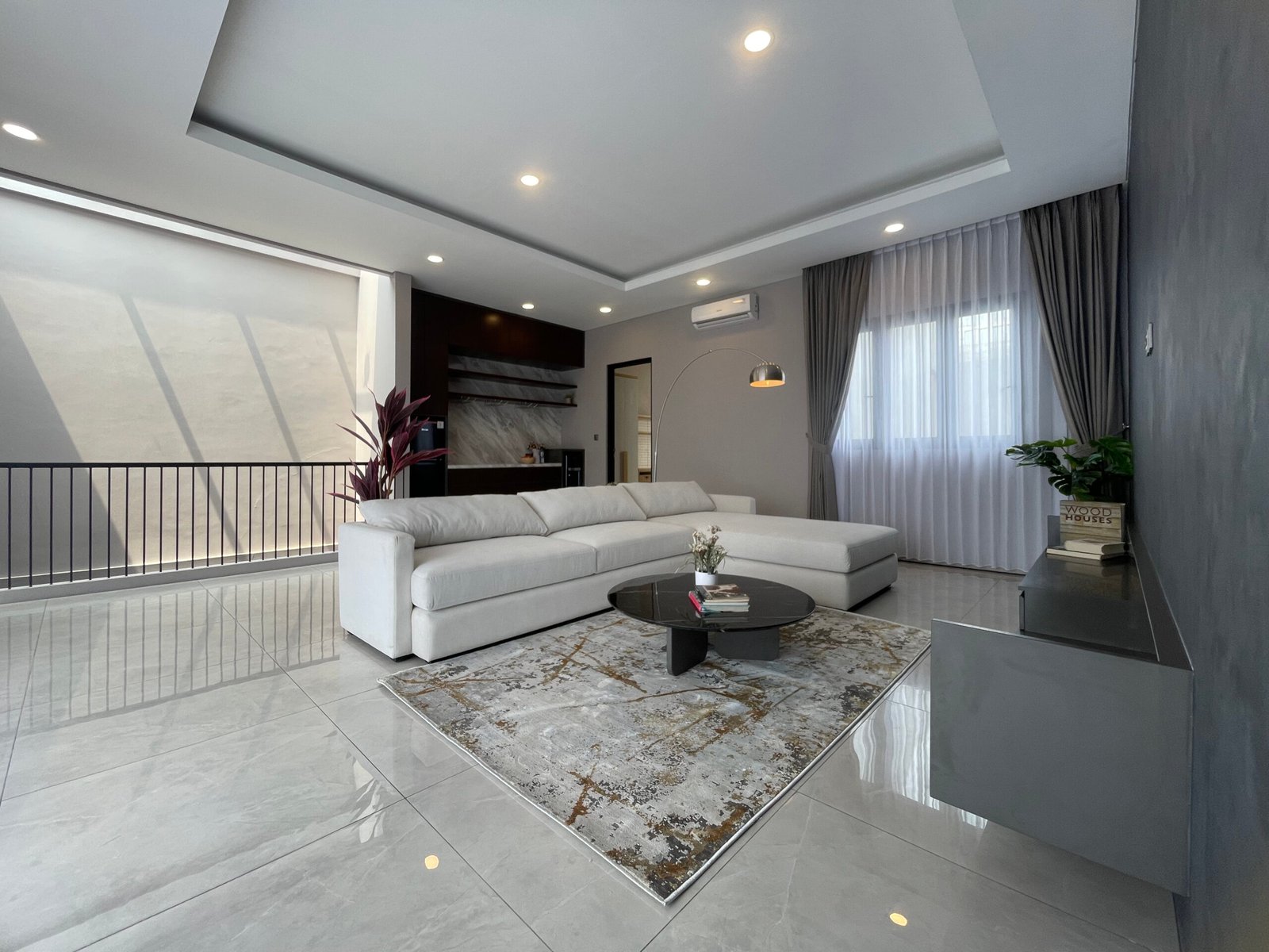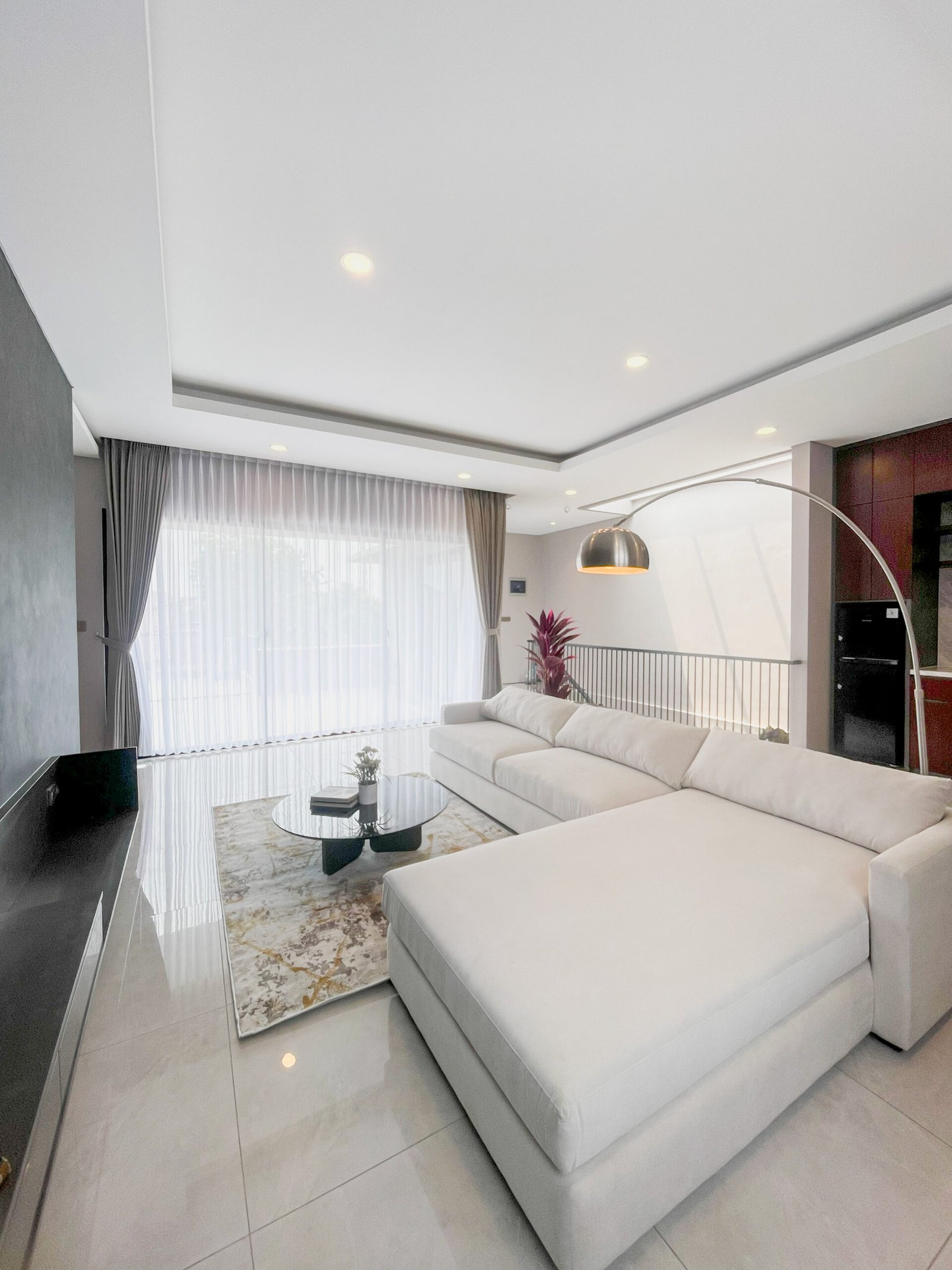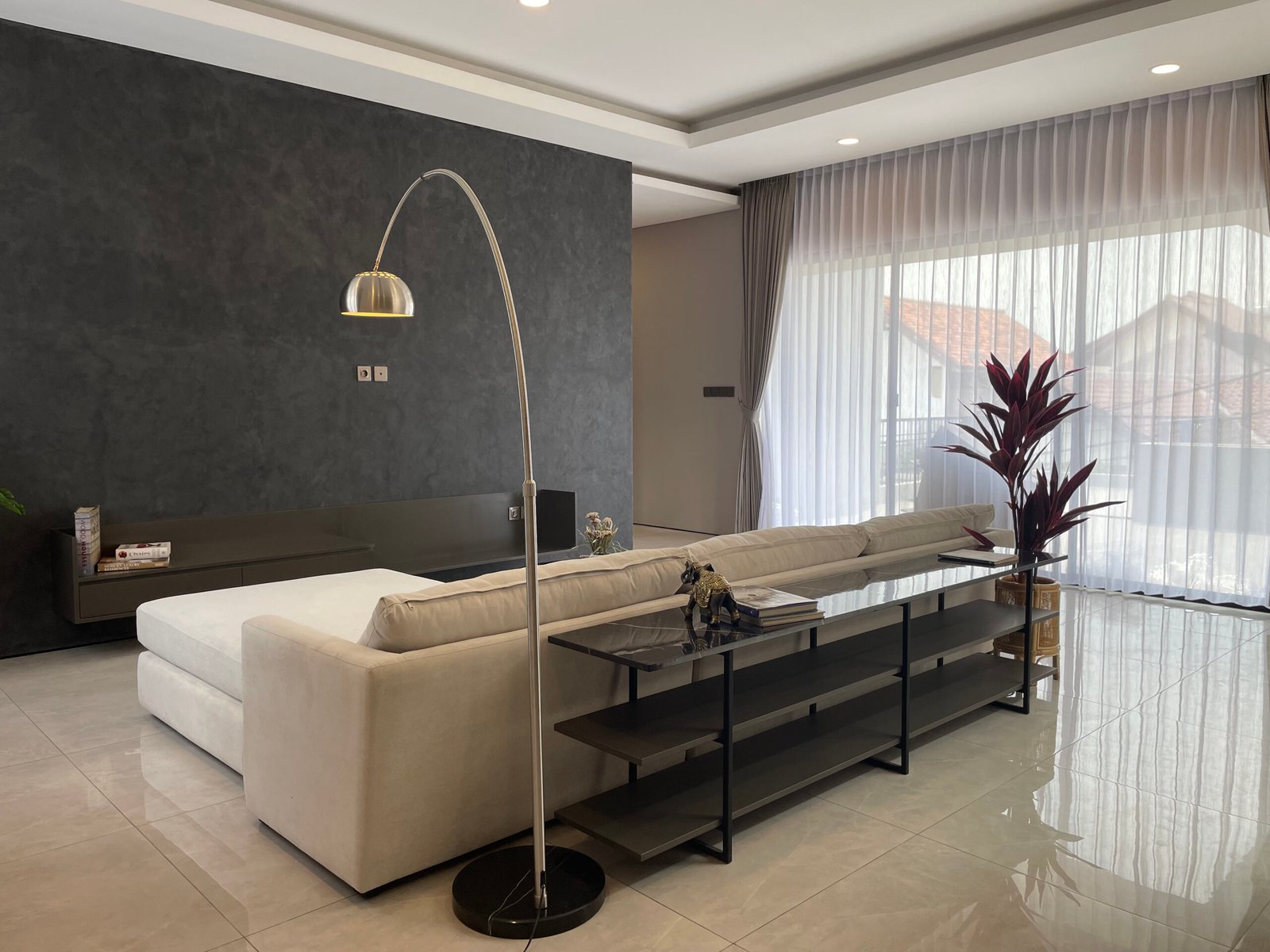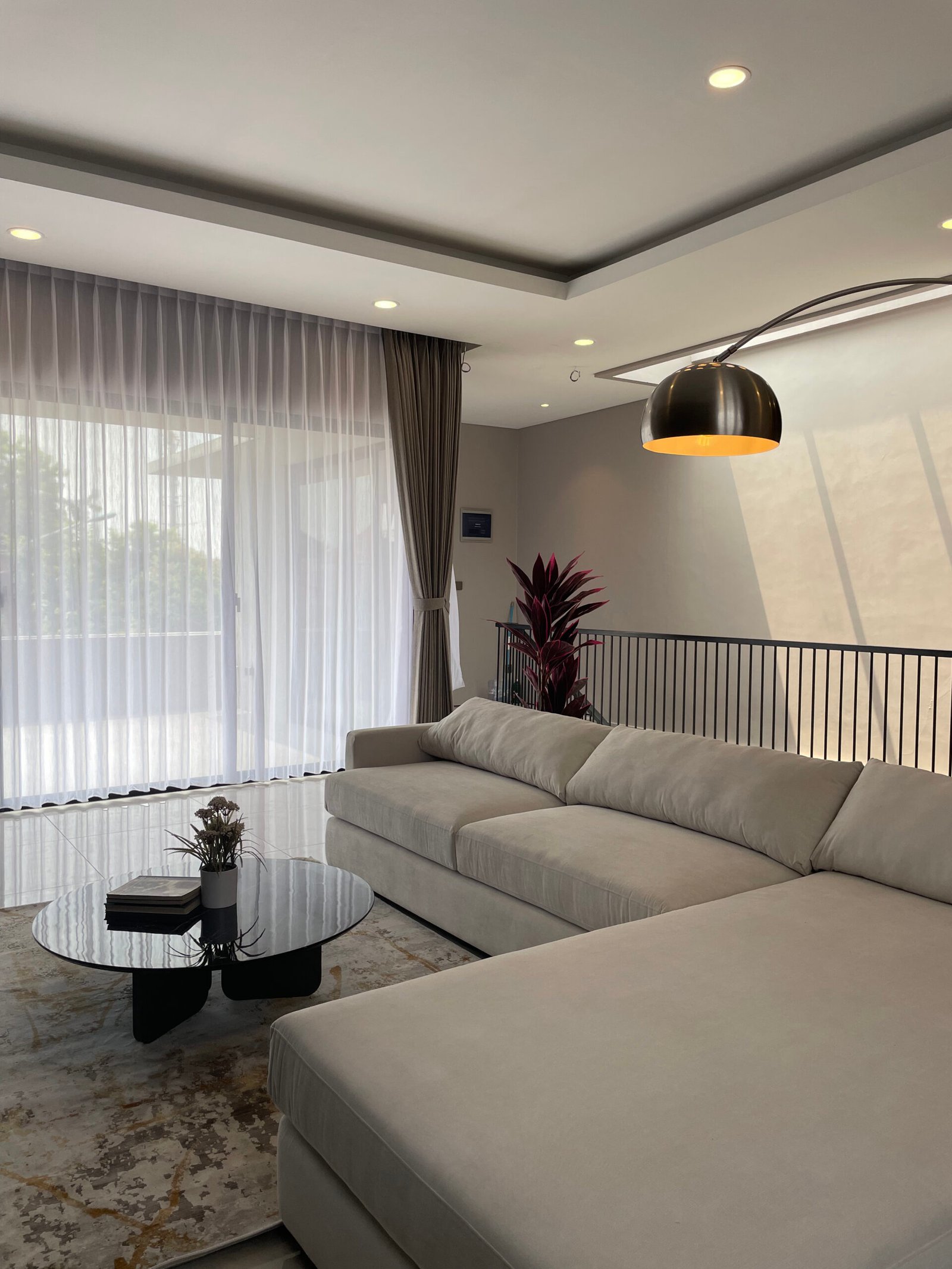 Living room ini mengusung konsep modern minimalis elegan, dengan nuansa clean, rapi, dan terang. Pemilihan sofa modular berwarna putih menghadirkan kesan luas sekaligus menjadi focal point yang menonjol. Permainan pencahayaan alami melalui curtain tipis dan tebal menciptakan atmosfer hangat dan fleksibel, baik siang maupun malam.
